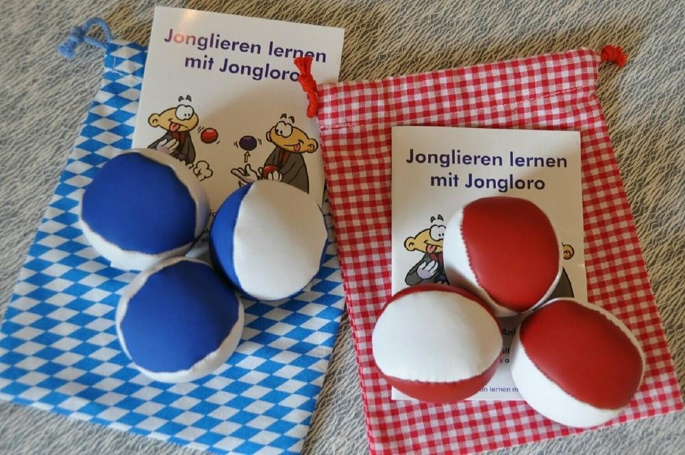 Drei weiß-blaue Bälle (Größe M, 90 gr) in einem weiß-blauen Stoffsäckchen oder drei rot-weiße Bälle (Größe M – 90 gr) in einem rot-weißen Säckchen. Auf Wunsch ist die 36-seitige Jonglier-Anleitung auch in bayerischer Sprache, kann aber auch in deutsch, englisch oder anderen Sprachen gewählt werden. Preis 29,90 € + Versand