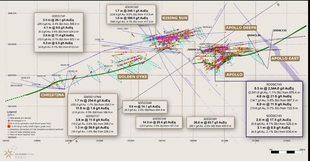 Das Bohrloch SDDSC139, das ursprünglich zur Erweiterung der Adersätze bei Apollo East vorgesehen war, wich von seiner geplanten Flugbahn ab und konnte die ursprüngliche Zielposition nicht durchschneiden. Während das Bohrloch vier mineralisierte Zonen durchteufte, erzielte nur eine davon signifikante Gehalte – der Adersatz A130, der 1,1 m mit 19,2 g/t AuEq ergab. Das Bohrloch enthielt drei Abschnitte mit >10 g/t Au (bis zu 77,5 g/t Au) und drei Abschnitte mit >5% Sb (bis zu 7,36% Sb). Zu den erweiterten Highlights gehören: