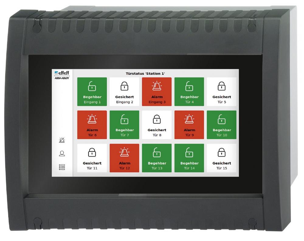 Fluchttürsteuerungen müssen zuverlässig funktionieren und den Menschen in einem Gebäude sowohl in Gefahren- als auch Paniksituationen eine sichere Flucht ermöglichen. Angesichts großer Gebäudeanlagen und ihrer hohen Anzahl von Fluchttüren bieten zentrale Bedientableaus einen hohen Mehrwert. Sie gewährleisten, dass alle Zustände der angebundenen Fluchttüren an einer zentralen Stelle zusammengeführt werden und bündeln die Steuerung der Funktionalitäten in einem Gebäudesystem. Das neue effeff Bedientableau 925 mit Touch-Display erlaubt Sicherheitsverantwortlichen die komfortable Anzeige von Türzuständen und das intuitive Steuern von bis zu 24 Fluchttüren oder Gruppenfunktionen.
