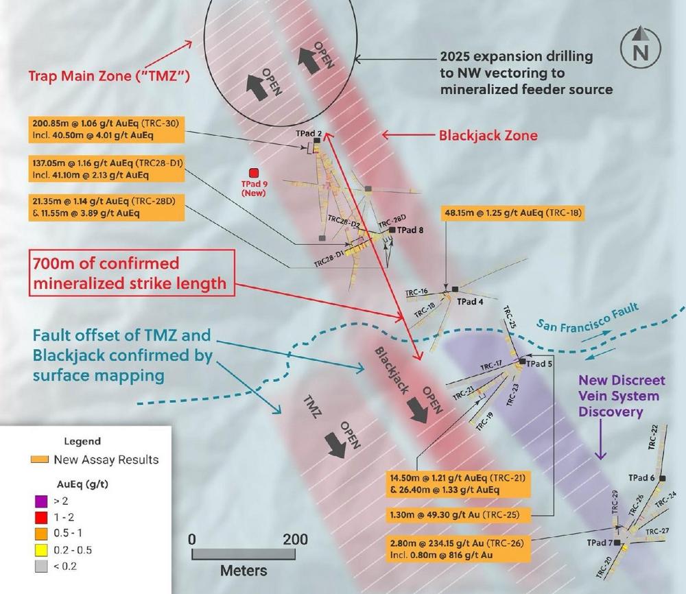 Das Unternehmen hat derzeit fünf Bohrgeräte im Rahmen seines vollständig finanzierten 60.000-Meter-Bohrprogramms für 2025 im Einsatz. Zwei weitere Bohrgeräte wurden unter Vertrag genommen; die Bohrungen werden voraussichtlich Ende Januar bzw. im Februar beginnen. Ari Sussman, Executive Chairman, kommentierte: "Trap zeigt weiterhin, dass das System viel Metall enthält, einschließlich der Entdeckung eines neuen hochgradigen goldhaltigen Adersystems. Eine detaillierte Analyse von Trap legt nahe, dass sowohl die TMZ- als auch die Blackjack-Zone im Jahr 2025 entlang des Streichs in nordwestlicher Richtung bebohrt werden sollten, da die Bohrungen stark darauf hindeuten, dass sich die metallhaltigen Flüssigkeiten in dieser Richtung intensivieren und auf ein mineralisiertes porphyrisches Feeder-System hindeuten könnten. Die Bohrungen wurden soeben wieder aufgenommen, und wir freuen uns darauf, Trap in diesem Jahr zu erweitern."