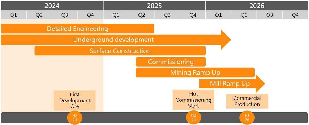 The project remains on schedule to start hot commissioning in H2 2025 and commercial production in H1 2026. The project’s main critical path activities include installation of the primary structural steel and cladding for the mill, installation of the SAG mill and Ball mill, installation of the paste plant, installation of copper and zinc flotation circuits and commissioning and ramp up to commercial production.