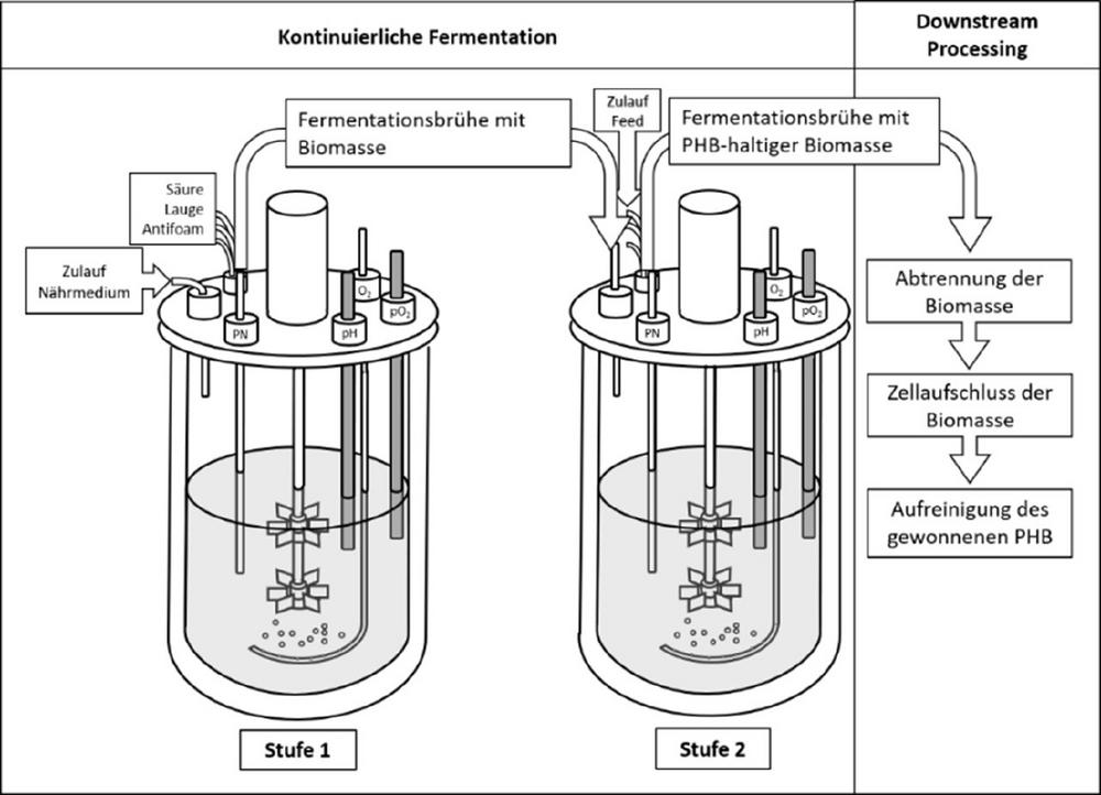 Das Biopolymer Polyhydroxybutyrat (PHB) wird aktuell im sogenannten Fed Batch-Verfahren hergestellt, bei dem es sich um einen diskontinuierlichen Prozess handelt. Die Herausforderung für die Wissenschaftler der beiden Institute war, diesen Prozess in einem kontinuierlichen Verfahren zu ermöglichen und gleichzeitig eine gleichmäßige Kettenlänge der Polymere zu erzielen.