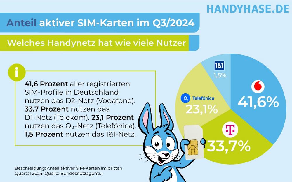 Unangefochten auf dem ersten Platz stand laut Bundesnetzagentur auch im dritten Quartal 2024 Vodafone mit großem Vorsprung. 41,6 Prozent der SIM-Karten sind in diesem Netz aktiv.