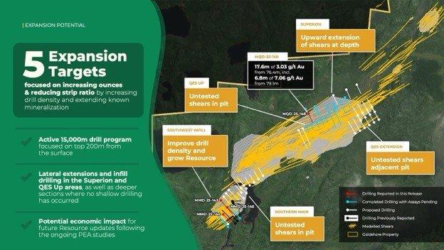 • Erste Ergebnisse des Superion-Prospekts mit MQD-25-148 haben eine neue goldmineralisierte Scherung etwa 60 m von der Oberfläche und 225 m nördlich der QES-Zone mit einem Abschnitt von entdeckt