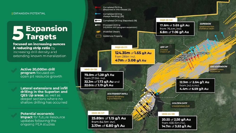 • Die Ergebnisse von zwei Bohrlöchern, mit denen bedeutende Bohrlücken in der Zone QES geschlossen wurden, durchschnitten weite Abschnitte mit goldmineralisierten Kernscharen, einschließlich des höchstgradigen x Mächtigkeit-Abschnitts, der jemals von Goldshore gemeldet wurde. Die Ergebnisse bestätigen das Vorhandensein einer oberflächennahen, hochgradigen Goldmineralisierung innerhalb der Kernscherungen und zeigen das Potenzial für die Entdeckung zusätzlicher tiefliegender Ausläufer.  Darüber hinaus übertrafen die Ergebnisse von MQD-25-171 die auf der aktuellen Mineralressourcenschätzung (MRE) basierenden Gehaltserwartungen mit besten Abschnitten von: