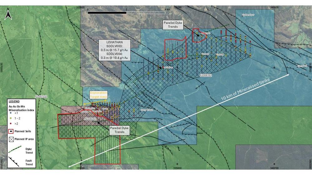 o The IP survey has extended over 12 km2 and covers 6 km strike (of the 12 km) of the dyke and altered sediment hosted gold mineralized trend to cover significant historical mining areas including Tonstal, Leviathan, Consols and Aftermath. Parallel dyke trends have also been tested. Analysis and interpretation are now ongoing and further results will be released once complete.