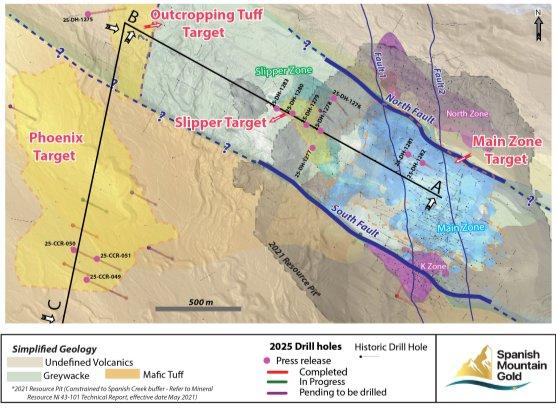 Peter Mah, President und CEO von Spanish Mountain Gold, erklärte: „Neben der Beschleunigung des Projekts hin zu einer Bauentscheidung bis 2027 sind wir von den ersten Bohrergebnissen für 2025 äußerst ermutigt, die weiterhin das bedeutende, kostengünstige Wachstumspotenzial für die Erweiterung der oberflächennahen und hochgradigen Goldmineralisierung über die durch den Abbau 2021 begrenzte Ressource hinaus belegen.“