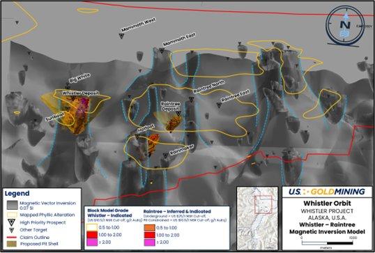 Tim Smith, Chief Executive Officer von U.S. GoldMining, kommentierte: "Das Gold-Kupfer-Projekt Whistler befindet sich innerhalb des Mineralbezirks West Susitna, der etablierte Gold-, Kupfer- und Silberressourcen sowie das Potenzial für andere wichtige Metalle wie Antimon und Wolfram enthält. Das Projekt Whistler, das nur 105 Meilen von Anchorage, Alaska, entfernt liegt, umfasst drei bekannte Mineralsysteme, die bestehende Gold-Kupfer-Silber-Lagerstätten und zahlreiche zusätzliche potenzielle Explorationsziele enthalten. Das im Norden der Claim-Gruppe gelegene Mineralsystem Whistler-Raintree enthält bereits zwei der drei bisher abgegrenzten Lagerstätten sowie über 25 zusätzliche einzelne potenzielle Explorationsziele, die auf einer Fläche von etwa 5 x 5 km identifiziert wurden. Dieses Gebiet, das auch als Whistler Orbit bekannt ist, wird von einem großen, ursächlichen Batholithen unterlagert, der einen ‚Porphyr-Cluster‘ aus mehreren hochgradigen Intrusivkörpern hervorgebracht hat, die für eine Gold-Kupfer-Silber-Mineralisierung im Porphyr-Stil in Frage kommen. Wir verfügen über eine etablierte Explorationsmethodik, einschließlich der Fähigkeit, die Intrusivkörper durch Inversionsmodellierung von magnetischen Vermessungsdaten in Verbindung mit geochemischen und Alterationsdaten direkt abzubilden, was uns dabei hilft, die Exploration auf die Ziele mit der höchsten Priorität auszurichten. Wir freuen uns über das Potenzial für systematische Explorationen, um zusätzliches Ressourcenwachstum bei Whistler zu erschließen."