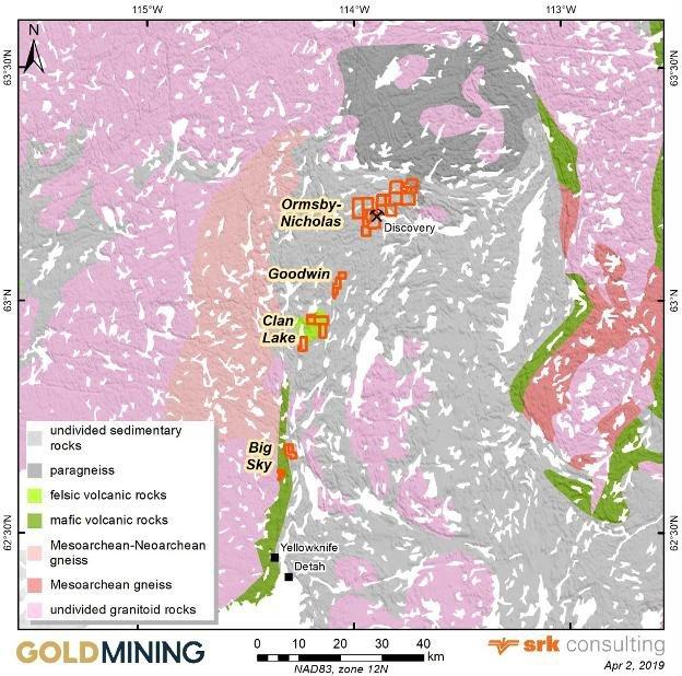 Das Yellowknife-Goldprojekt, das sich entlang des etwa 100 Kilometer langen Yellowknife-Greenstone-Gürtels befindet, besteht aus fünf einzelnen Grundstücken: Ormsby – Bruce, Nicholas Lake, Goodwin Lake, Clan Lake und Big Sky (siehe Abbildung 1). Das Grundstück Ormsby beherbergt die Mine Discovery, die von 1950 bis 1969 betrieben wurde und eine Gesamtproduktion von schätzungsweise 1.023.550 Unzen Gold aus 1.018.800 kurzen Tonnen (st) Erz aufwies. Der durchschnittliche Produktionsgehalt von etwas mehr als einer Unze Gold pro Tonne gilt allgemein als der höchste Durchschnittsgehalt des produzierten Goldes im Yellowknife-Goldbezirk und als eine der hochgradigsten Goldminen in Kanada mit einer Produktion von über einer Million Unzen Gold. Die Verweise auf frühere Produktionsaktivitäten in der Goldmine Discovery dienen nur zu Informationszwecken und sind nicht als Indikator für zukünftige Explorationen auf dem Projekt gedacht.