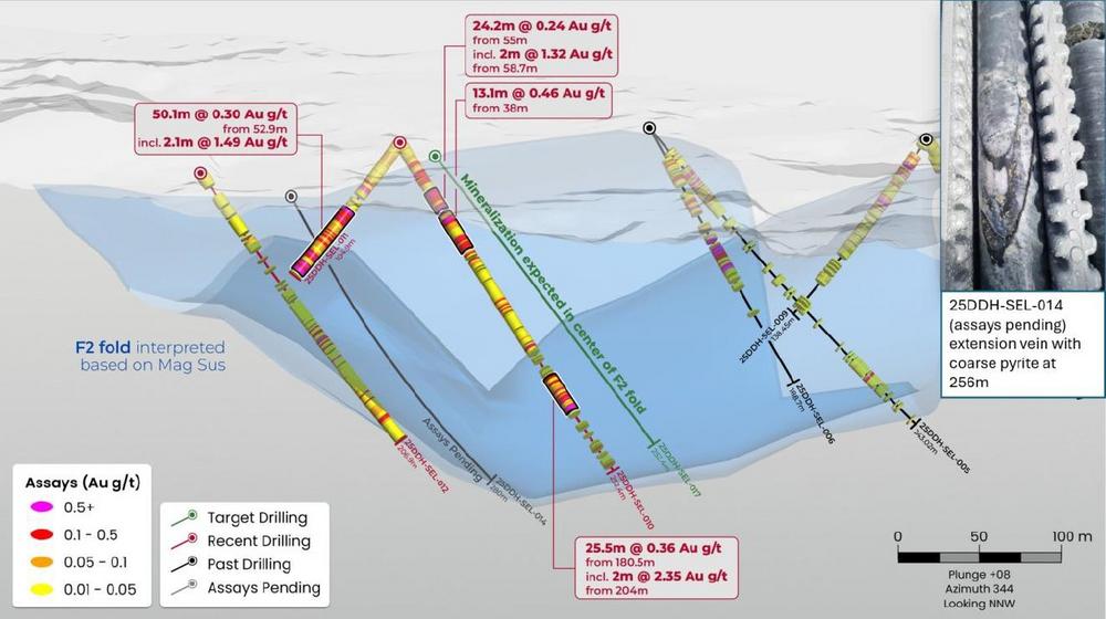 Die Löcher 25DDH-SEL-15 und 16 wurden unterhalb einer aktiven Grube gebohrt und zielten sowohl auf eine mineralisierte Scherung als auch auf eine F2-Faltung im östlichen Teil von Golden Hand ab. Loch 25DDH-SEL-17 wurde näher am Zentrum der mineralisierten Strukturzone gebohrt, wo die flach einfallenden Adern in den Löchern 25DDH-SEL-10 bis 12 durchschnitten wurden. Dieselbe Zone wurde auch in Loch 25DDH-SEL-14 durchteuft und ergab sulfidhaltige Adern auf 256 m (Abb. 1). Die Löcher 25DDH-SEL-15 und 16 wurden in einer aktiven Grube auf der Ostseite von Golden Hand gebohrt und erprobten eine ähnliche strukturelle Zone.