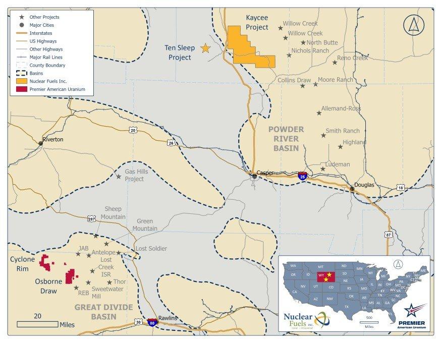 Figure 1: Location of Nuclear Fuels’ Kaycee Project in Wyoming’s Powder River Basin, situated near Premier American Uranium’s Cyclone Project in the neighbouring Great Divide Basin.