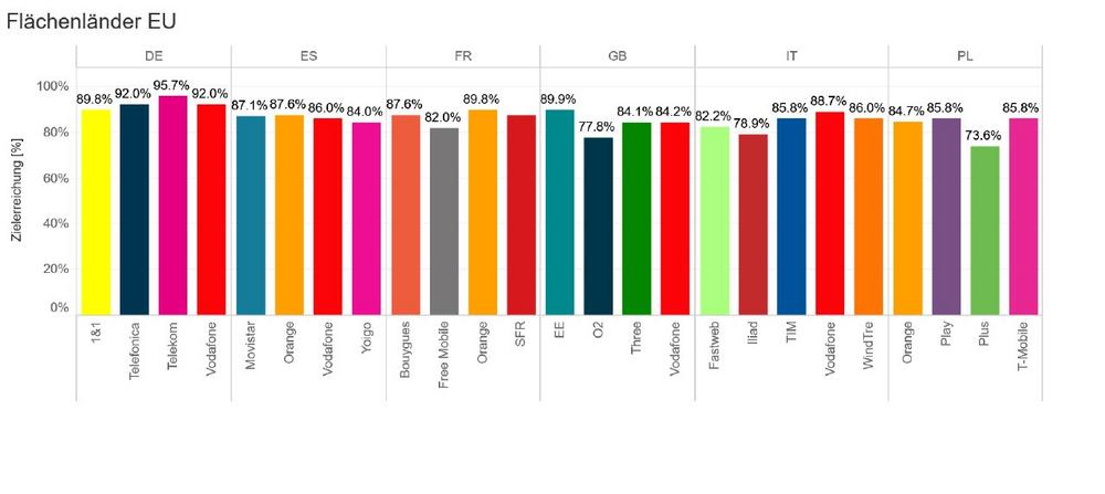 Die Ergebnisse der Crowdsourcing-Analyse sprechen für sich: An der Spitze steht die Deutsche Telekom mit einem Erfüllungsgrad von 95,7 Prozent, dahinter folgen Telefónica/O2 und Vodafone. Auch British Telecom und Orange aus Frankreich gehören zu den Top Fünf, während 1&1 Deutschland mit 89,8 Prozent Zielerreichung überzeugt und sich damit nur knapp hinter dem bestplatzierten französischen Anbieter auf Platz sechs einreiht. Insgesamt sind damit die vier deutschen Anbieter unter den besten Zehn vertreten – zusammen mit jeweils einem Anbieter aus Italien, Spanien und Großbritannien sowie drei aus Frankreich. Das zeigt: Im europäischen Vergleich der Flächenländer genießen deutsche Mobilfunkkunden eine überdurchschnittlich hohe Netzqualität.
