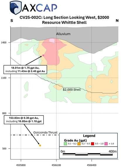 Die Golconda-Überschiebung ist ein bedeutendes strukturelles Merkmal, das mit mehreren großen Goldsystemen in Nevada in Zusammenhang steht, darunter die Minen Marigold und Lonetree. Die Bohrungen von Axcap bestätigen, dass die Antler Peak-Formation, ein bekanntes Wirtsgestein für die Mineralisierung dieser Lagerstätten, unterhalb der aktuellen Converse-Ressource vorhanden ist. Ein mächtiger Abschnitt von 153,83 Metern mit 0,30 g/t Gold, 1,22 g/t Silber und 0,10 % Kupfer innerhalb der Antler Peak-Formation enthielt den hervorgehobenen Abschnitt von 10,85 Metern mit 1,18 g/t Gold, 3,55 g/t Silber und 0,39 % Kupfer.