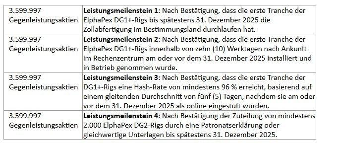 14.399.988 der Gegenleistungsaktien unterliegen den vier (4) unten aufgeführten Leistungsmeilensteinen, um die Interessen der Dogecoin-Aktionäre an den langfristigen Wachstumszielen des Unternehmens auszurichten. Falls das Unternehmen den unten angegebenen Leistungsmeilenstein nicht erreicht, gibt jeder Dogecoin-Aktionär unverzüglich die entsprechende Anzahl von Gegenleistungsaktien an das Unternehmen zurück, und nach Erhalt annuliert das Unternehmen diese Gegenleistungsaktien unverzüglich.