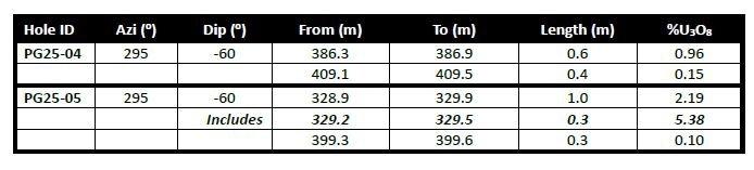 Hole PG25-05 was collared 44 metres in front of PG25-04 and drilled using the same azimuth of 295 degrees and dip of -60 degrees. This hole intercepted the radioactive structure approximately 40 metres up-dip of PG25-04. The hole encountered the unconformity at 309 metres, paleoweathered granitic gneiss and pegmatites to 371 metres, then garnet-rich pelitic gneiss, locally with pyrite and graphite, to the completion depth of 498 metres. The central mineralized structure was hosted in a sheared / brecciated reddish-brown altered granitic gneiss that returned 1.0 metre of 2.2% U3O8 between 328.9 and 329.9 metres and included 0.3 metres of 5.4% U3O8 (Table 1).
