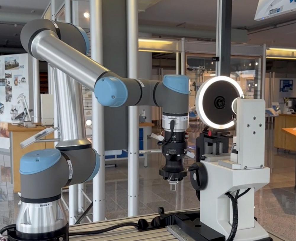 Das hochpräzise Messuhren- und Feinzeigerprüfgerät MFP 50 / 50 BV ist ein vollautomatisches Messsystem von Feinmess Suhl für analoge und digitale Messuhren sowie jegliche Art von Messtaster. Damit ist der Anwender in der Lage, analoge und digitale Messuhren auch ohne Interface-Kabel wirtschaftlich und schnell zu prüfen. Dank einer innovativen Steuerungs- und Messsoftware werden die Messergebnisse automatisch erfasst und verarbeitet. Weiterhin können verschiedene Prüfmittelverwaltungssysteme eingebunden werden. Feinmess Suhl bietet damit eine leistungsstarke Lösung für effiziente und dokumentierte Prüfprozesse. Die vollautomatische Bestückung mit einem Cobot erweitert das System nun um einen entscheidenden Baustein in Richtung Industrie 4.0. „Das Projekt wurde in enger Zusammenarbeit mit Partnern umgesetzt, wie Universal Robots sowie der Software-Firma AHP“, erklärt Sebastian Höller, aus der Entwicklung bei Feinmess Suhl. „Ziel war es, einen funktionalen Messe-Demonstrator zu realisieren, der unser Prüfgerät mit Messuhren bestückt, präzise einstellt, vermisst und bewertet – ohne manuelles Eingreifen.“