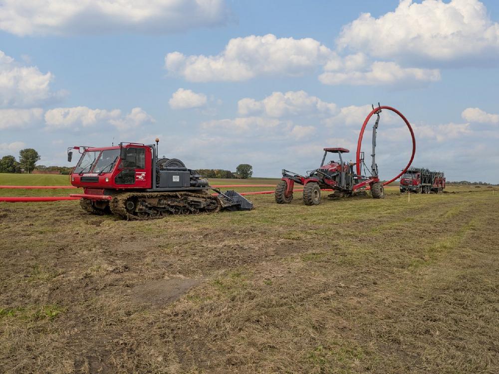 Eine echte Weltneuheit sind die diesjährig erstmals eingesetzten Delta-Laufwerke am Kabelpflug. Sie verbinden höchste Geländetauglichkeit mit maximalem Bodenschutz und setzen damit neue Maßstäbe in der Kabelverlegung. „Unser Verfahren bleibt beim Bodendruck deutlich unter den geforderten Grenzwerten. Schonender kann man Leitungen kaum verlegen“, erklärt Marco Leykauf. Dies ist ein klarer Vorteil für den Einsatz in sensiblen Landschaften und bedeutet insbesondere eine spürbare Entlastung für landwirtschaftlich genutzte Flächen.