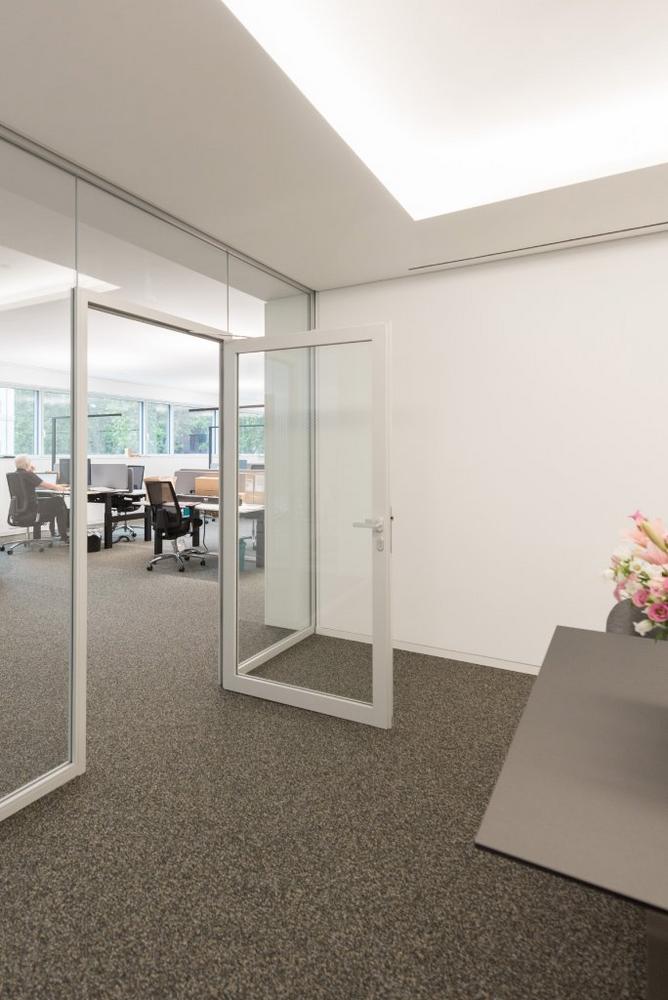 Als funktionelles wie gestalterisches Element eignen sich hier schalldämmende Glaselemente und Rahmentüren in Aluminiumzargen. Diese strukturieren Räume, trennen Bereiche ab und mit entsprechender Ausstattung reduzieren sie die störende Schallübertragung deutlich, was fokussiertes Arbeiten ohne Ablenkung ermöglicht. Gleichzeitig erhalten sie die Transparenz, Teilhabe und Offenheit, die das Arbeiten in offenen Spaces ausmacht: Durch die Glaselemente fällt das Licht weiter ungehindert durch den Raum. Und Glas ermöglicht Sichtkontakt und fördert so die gewünschte Interaktion. Daneben bieten die modular aufgebauten Lösungen aus Glas und Aluminiumprofilen die notwendige Planungsfreiheit, um bestehende Räume flexibel und mit geringem Aufwand zu gestalten.