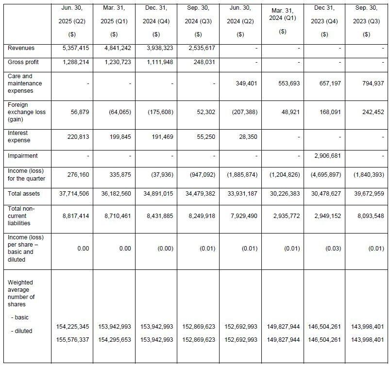 – Revenues of US$5.4 Million in Q2 2025, Gross Profit of US$1.3 Million