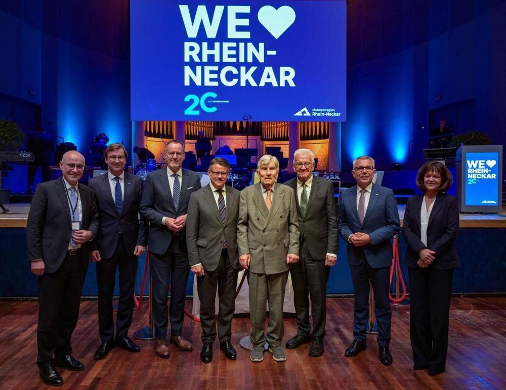 Den emotionalen Höhepunkt des Festakts bildete zum Abschluss die Verleihung des Carl-Theodor-Preises der Metropolregion Rhein-Neckar an Dr. h.c. Eggert Voscherau, einen der Gründerväter der Metropolregion Rhein-Neckar. Der gebürtige Hamburger war in seiner Zeit als Vorstandsmitglied und Arbeitsdirektor der BASF und Sprecher der Initiative „Zukunft Rhein-Neckar-Dreieck“ der maßgebliche Treiber seitens der Wirtschaft, um die entscheidenden Schritte zur heutigen MRN zu verwirklichen. Die Laudatio auf den Geehrten hielt die ehemalige Verbandsvorsitzende und Oberbürgermeisterin a.D. der Stadt Ludwigshafen, Dr. Eva Lohse. Lohse würdigte den 82-Jährigen in ihrer Rede als „Mister Metropolregion“, der schon früh erkannte, dass die Region Rhein-Neckar zwar alles mitbringt, was es braucht, um zu einer der führenden europäischen Regionen zu werden. Was ihr jedoch fehlte, war eine (institutionelle) Struktur, eine gemeinsame Idee, ein verbindendes Ziel. Die Zusammenführung von Initiative und Verein, die Gründung der MRN GmbH, die Verstetigung der Zusammenarbeit über Ländergrenzen hinweg – all das war kein Selbstläufer. Es brauchte den Mut und langen Atem vieler Protagonisten – ohne Eggert Voscherau als Antreiber aber wäre die gemeinschaftliche Regionalentwicklung nicht das Erfolgsmodell, das es heute ist. Ein Fundament, auf dem wir heute weiterbauen.