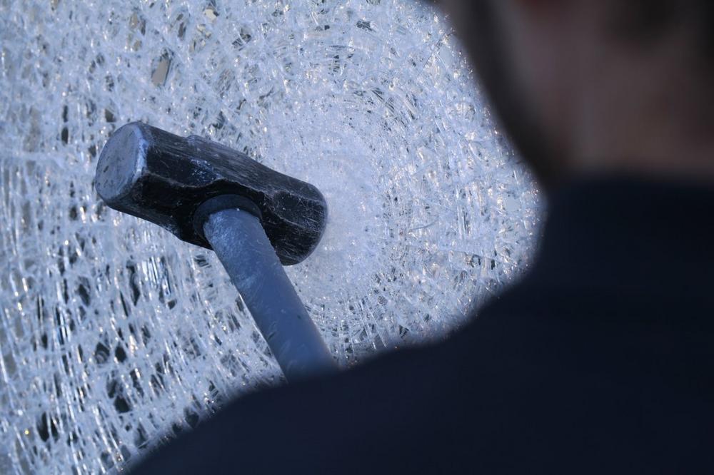 "OK, Eddie", sagt Christoph. Und der, mit Schutzbrille ausgerüstet, drischt mit dem Vorschlaghammer drauf los. Für das "P4A" braucht er nur ein paar Schläge. Beim "P6B" schon etwas länger: handgestoppte 34 Sekunden. Beim dritten, dem "SILATEC P6B" kann Eddie irgendwann nicht mehr. Christoph winkt einen Kollegen dazu. Mit einer Axt. Jetzt also im Wechsel: Axt, Hammer, Axt, Hammer, Axt, … Bei knapp drei Minuten können beide nicht mehr. Das Glas aber schon. Es steht immer noch unbezwungen da.
