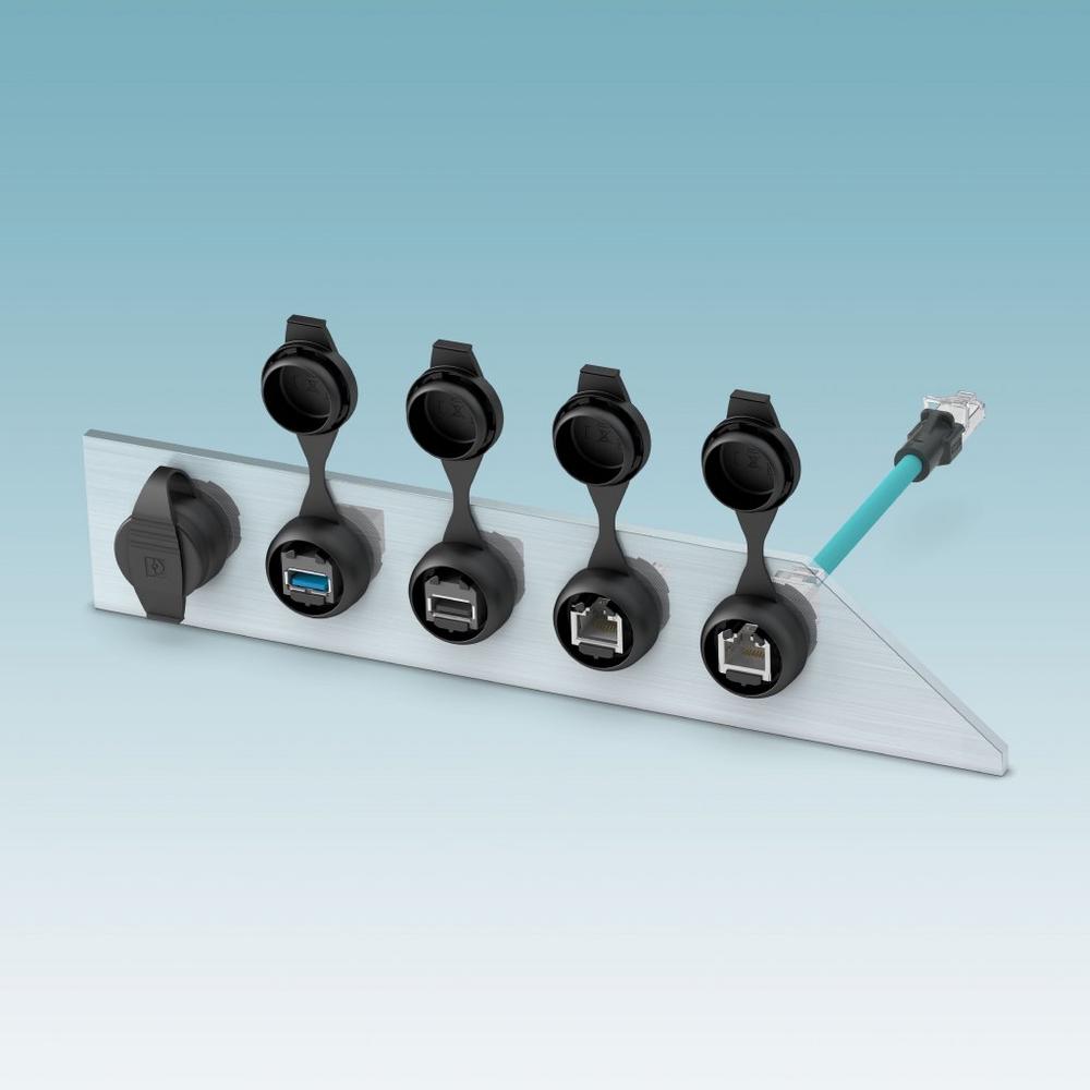 Die DSI umfassen Kupplungsmodule wie USB-Typ A 2.0, USB-Typ A 3.0 und RJ45 CAT6A sowie Kabelanschlussmodule in der Ausführung RJ45 CAT6A. Durch die erhöhte IP-Schutzklasse von IP65/IP67 bei geschlossenem Schutzdeckel sind die DSI ideal für den Einsatz in industriellen Umgebungen. Sie ermöglichen eine direkte, einfache und schnelle Durchführung von z. B. Updates und Wartungsarbeiten an geschlossenen Schaltschränken und Geräten, wodurch lange Prozessunterbrechungen vermieden werden. Die DSI eignen sich für die Vorderwandmontage bei Wandstärken von 1 mm bis 5 mm. Durch den standartisierten Wandausbruch von Ø22,5 mm ermöglichen die Schnittstellen einen platzsparenden Einbau. Die Installation erfolgt werkzeuglos und in kurzer Zeit. Darüber hinaus besteht die Möglichkeit zur Individualisierung mit eigenem Logo.