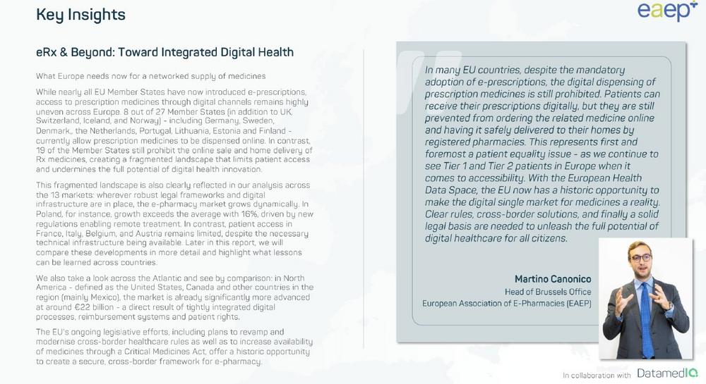 „Für Patientinnen und Patienten – insbesondere in unterversorgten Regionen – kann die Kombination aus E-Rezept, Telepharmazie und der Möglichkeit, Rx-Arzneimittel bei zugelassenen Online-Apotheken zu bestellen, messbare Vorteile bringen. Ein kohärenter EU-Regulierungsrahmen schafft die dafür erforderliche Planungs- und Investitionssicherheit“, so Martino Canonico, Leiter des Brüsseler Büros der European Association of E-Pharmacies (EAEP).