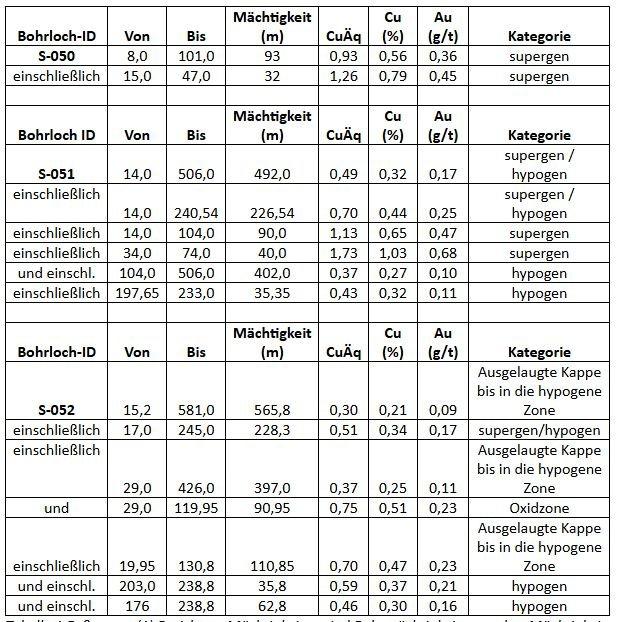 Die ersten drei Bohrlöcher durchteuften alle bedeutende supergen angereicherte Mineralisierung in den ersten 100 Metern mit einem Übergang zu hypogener Zone unter den Verwerfungsstrukturen, die vertikale und laterale Kontinuität in der Tiefe aufweisen. Bohrloch S-050, 50 Meter östlich des historischen Bohrlochs S-048 gelegen, wurde in einer Tiefe von 101 Metern aufgegeben, da es auf Ton-Gouge stieß, lieferte jedoch wertvolle Informationen in Bezug auf die supergene Kappe. Bohrloch S-051 wurde im Bohrkragen westlich von Bohrloch S-050 angelegt und durchteufte durchgängige supergene Anreicherung in den ersten 100 Metern, die in einer Tiefe von 538 Metern in hypogene Mineralisierung überging. Bohrloch S-052 wurde im Bohrkragen 100 Meter nördlich von Bohrloch S-050 angelegt und war das bisher tiefste Bohrloch in einer Tiefe von ungefähr 674 Metern. Auch dieses Bohrloch bestätigte das supergene System und den nachfolgenden Übergang zu hypogener Mineralisierung unterhalb der Schwelle von 100 Metern. Bohrloch S-052 durchteufte eine ähnliche Zone in einer Tiefe von 200 Metern und bestätigte zusammen mit den Ergebnissen aus S-051 robuste Kontinuität (siehe Abbildung 1).