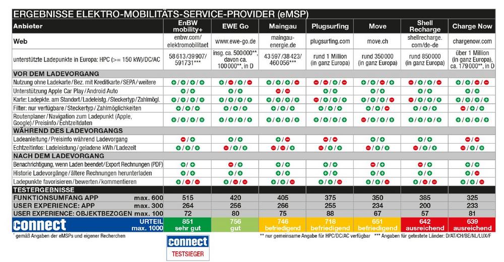 EnBW sichert sich in Deutschland zum siebten Mal in Folge den ersten Platz in der eMSP-Kategorie mit 851 von 1.000 Punkten, Aral Pulse belegt in der CPO-Bewertung mit 858 Punkten den Spitzenplatz. Beide Anbieter wurden mit der Note „sehr gut“ ausgezeichnet. Platz zwei in Deutschland erreicht Mer mit 831 Punkten und der Note „gut“. In Österreich erreicht Shell Recharge mit 795 Punkten und der Note „gut“ den ersten Platz, es folgt Mer mit 772 Punkten und ebenfalls der Note „gut“. In der Schweiz führt GoFast mit 796 Punkten, dahinter kommt Ionity mit 778 Punkten, beide erhalten die Note „gut“.