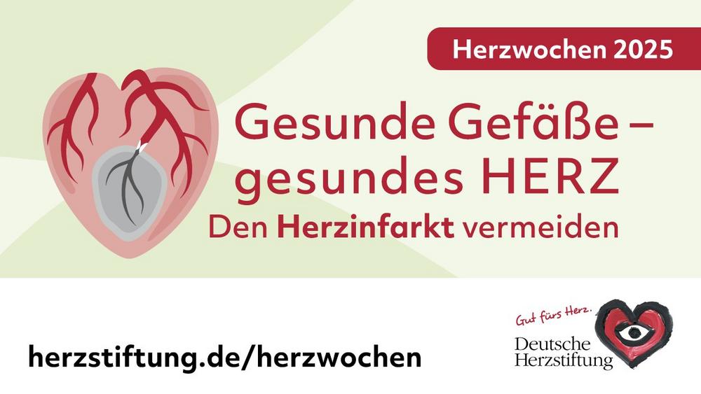 Die Herzwochen stehen unter dem Motto „Gesunde Gefäße – gesundes Herz: Den Herzinfarkt vermeiden“ und richten sich an Patienten, Angehörige, Ärzte und alle, die sich für das Thema Koronare Herzkrankheit (KHK) und Herzinfarkt interessieren. An der Aufklärungskampagne beteiligen sich Kliniken, niedergelassene Kardiologen, Krankenkassen und Betriebe. Infos zu Patienten-Seminaren, Online-Vorträgen, Telefonaktionen und Ratgeber-Angeboten (Text, Video) sind ab Anfang Oktober unter https://herzstiftung.de/herzwochen abrufbar oder per Tel. 069 955128-400 zu erfragen.