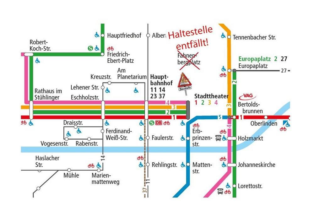 Die Haltestelle Fahnenbergplatz entfällt während der gesamten Bauzeit. Weil der Abschnitt zwischen Bertoldsbrunnen und Stadttheater nicht befahrbar ist, müssen Fahrgäste je nach Verbindung eine Wegstrecke von etwa 300 Metern zurücklegen.