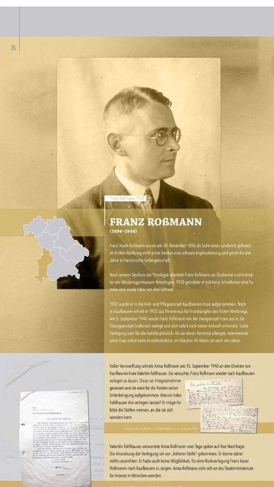 Gemeinsam mit Kolleginnen und Kollegen aus den drei NS-„Euthanasie“-Gedenkstätten Pirna-Sonnenstein (Sachsen), Grafeneck (Baden-Württemberg) und Hartheim (Oberösterreich) wird im Anschluss an die Gedenkveranstaltung die neue Wanderausstellung Ermordet in Grafeneck, Hartheim und Pirna-Sonnenstein – Die Opfer der "Aktion T4" aus Bayern eröffnet. Sie erinnert an über 7.600 Patientinnen und Patienten, die in den Jahren 1940 und 1941 aus Heil- und Pflegeanstalten auf dem Gebiet des heutigen Freistaats Opfer der zentralen Phase der NS-„Euthanasie“ wurden – darunter auch mehr als 600 Patientinnen und Patienten der ehemaligen Heil- und Pflegeanstalt Kaufbeuren-Irsee.