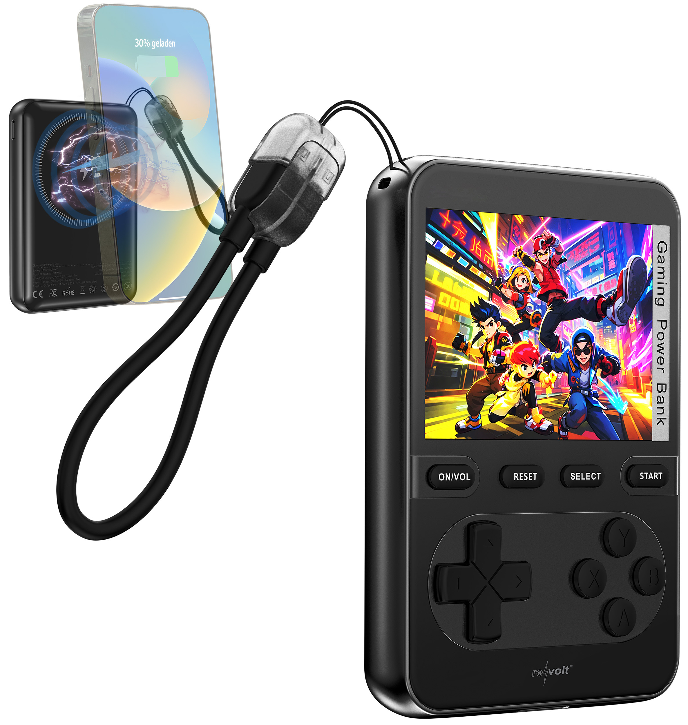 Gaming-Konsole und Powerbank in einem: Die Gaming-Powerbank von revolt kombiniert Spielspaß mit Stromversorgung: Etwa zweihundert vorinstallierte Retro‑Spiele aus den unterschiedlichsten Genres – von kniffligen Puzzles über rasante Shooter bis zu Denk‑ und Sporttiteln – bieten kurze, fesselnde Spielpausen, untermalt von passender Hintergrundmusik. Gleichzeitig fungiert es als Ladestation für mobile Endgeräte. Dank Qi‑ und MagSafe‑Support ist kabelloses Laden möglich, wobei die magnetische Halterung für eine sichere Fixierung sorgt.