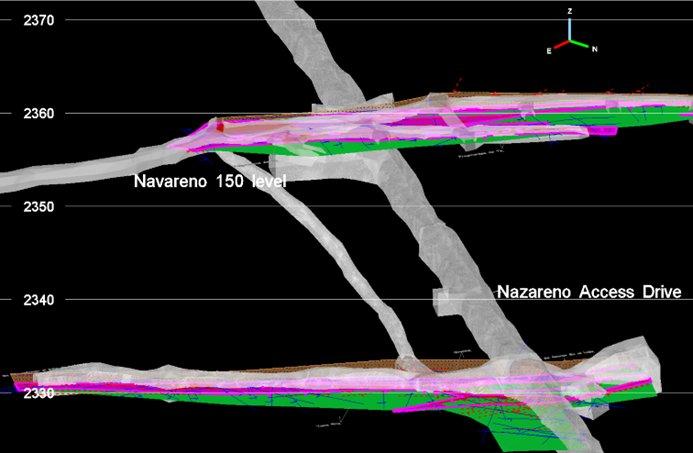 Entwicklungssprengungen in Nazareno, gefolgt von einer detaillierten Kartierung, haben ergeben, dass mehrere silber- und goldhaltige Gänge in diesem Gebiet zusammenlaufen und eine bis zu 8 Meter breite Zone bilden. Abbildung 1 unten zeigt eine nordwestliche Ansicht der Abbaustätten mit der neuen Kartierung von Sierra Madre. Der Zugangsstollen und die Sohle 150 sind durch 30 vertikale Meter voneinander getrennt.