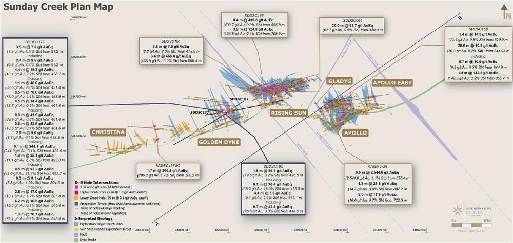 Michael Hudson, President & CEO states: "SDDSC177’s intersection of ten distinct vein sets over 168 m at 3.0 g/t AuEq (uncut) with cumulative intercepts exceeding 500 g/t AuEq x m demonstrates the substantial metal endowment at Golden Dyke. We’ve confirmed a 100 m vertical extension on the GD120 vein set and discovered a new high-grade vein set that returned 52.3% Sb over 0.2 m with 35.9 g/t Au – the third-highest antimony assay across the entire Sunday Creek project.
