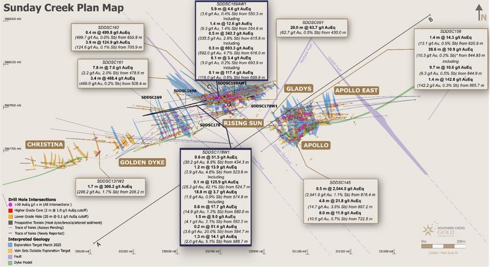Southern Cross Gold Consolidated Ltd. ( TSX: SXGC , ASX: SX2, OTCQX: SXGCF) kontrolliert das Sunday Creek Gold-Antimon-Projekt, das sich 60 km nördlich von Melbourne, Australien, befindet. Sunday Creek hat sich zu einer der bedeutendsten Gold- und Antimon-Entdeckungen der westlichen Welt entwickelt, mit außergewöhnlichen Bohrergebnissen, darunter 70 Abschnitte mit mehr als 100 g/t AuEq x m aus nur 97,5 km Bohrungen. Die Mineralisierung folgt einer „Golden Ladder”-Struktur über eine Streichlänge von 12 km, deren Kontinuität von der Oberfläche bis in eine Tiefe von 1.100 m bestätigt wurde.