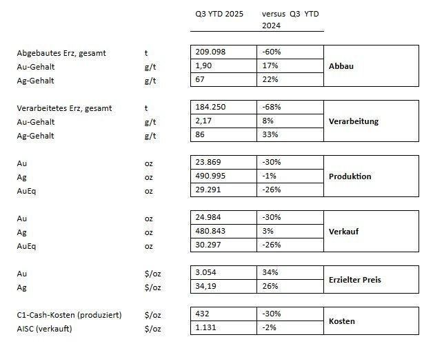 – Die Produktion per Q3 2025 YTD liegt weiterhin im Plan, um die Prognose von 36.000 bis 38.000 oz AuÄq für das gesamte Jahr zu erreichen.