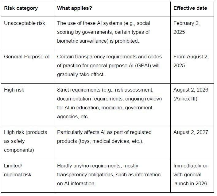 The EU AI Act will come into force in stages, depending on the risk classification of an AI system. Here are the most important dates by risk class: (see Photo)