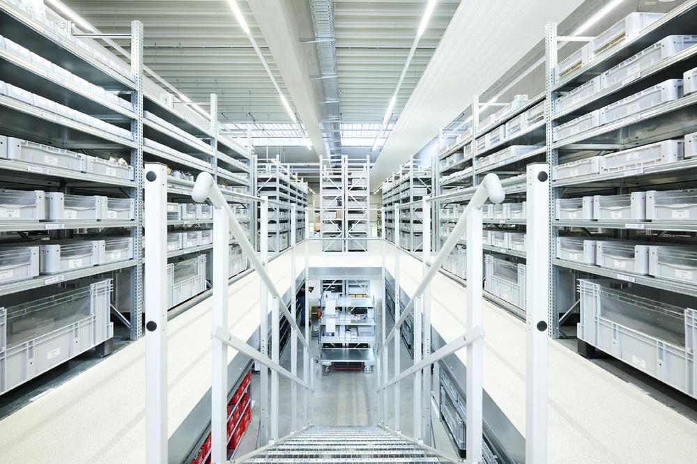 Effiziente, strukturierte Kleinteilelagerung in BITO XL Behältern und BITO Regalkästen in Sonderfarbe in BITO Mehrgeschossanlage
