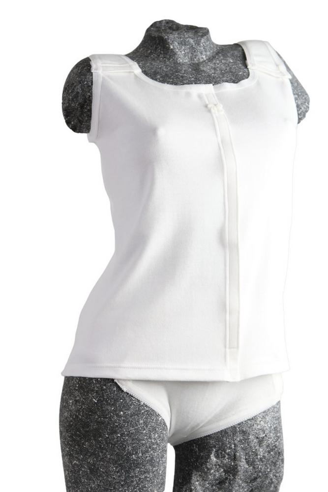 Genau an diesem Punkt kommen saba Unterhemden und saba Slips zum Einsatz. Die Funktionswäsche ist vorn senkrecht geteilt: Sie wird um den Körper gelegt, nicht übergestreift – und anschließend mit leichtgängigen Klettverschlüssen geschlossen. Das reduziert schmerzhafte Hebe- und Drehbewegungen, ermöglicht einhändige Handgriffe und nimmt die Angst vor „verbotenen“ Bewegungen. Die saba Unterhose hat einen doppelten Verschluss, so dass sie am Körper bleibt, auch wenn sie geöffnet ist; eine Riesenerleichterung beim Toilettengang. Die Passform bleibt im Sitzen, Liegen und beim Transfer stabil; Öffnen für Verbände oder Einlagen ist punktgenau möglich, ohne vollständiges Entkleiden.