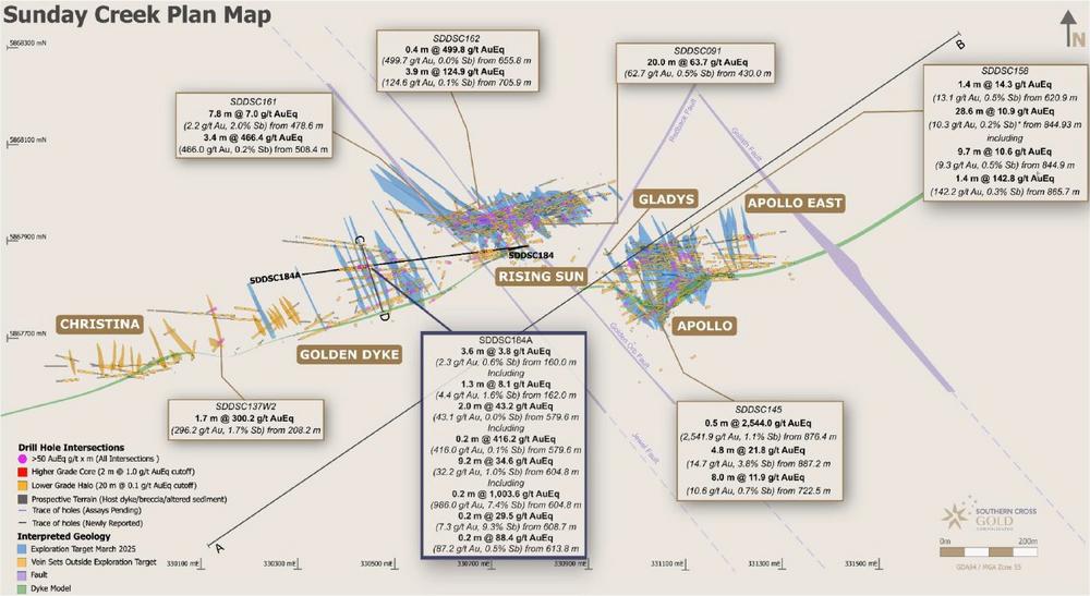 Southern Cross Gold Consolidated Ltd („SXGC” oder das „Unternehmen”) (- https://www.commodity-tv.com/play/southern-cross-gold-200000m-drill-program-to-significantly-increase-the-resource-target/ -) (TSX:SXGC) (ASX:SX2) (OTCQX:SXGCF) (Frankfurt: MV3.F) gibt die Ergebnisse von SDDSC184A im Prospektionsgebiet Golden Dyke im zu 100 % unternehmenseigenen Gold-Antimon-Projekt Sunday Creek in Victoria bekannt (Abbildungen 1 bis 6). Zu den besten Ergebnissen zählen 9,2 m mit 34,6 g/t AuEq (32,2 g/t Au, 1,0 % Sb) ab 604,8 m, einschließlich 0,2 m mit 1.003,6 g/t AuEq (986,0 g/t Au, 7,4 % Sb) ab 604,8 m.