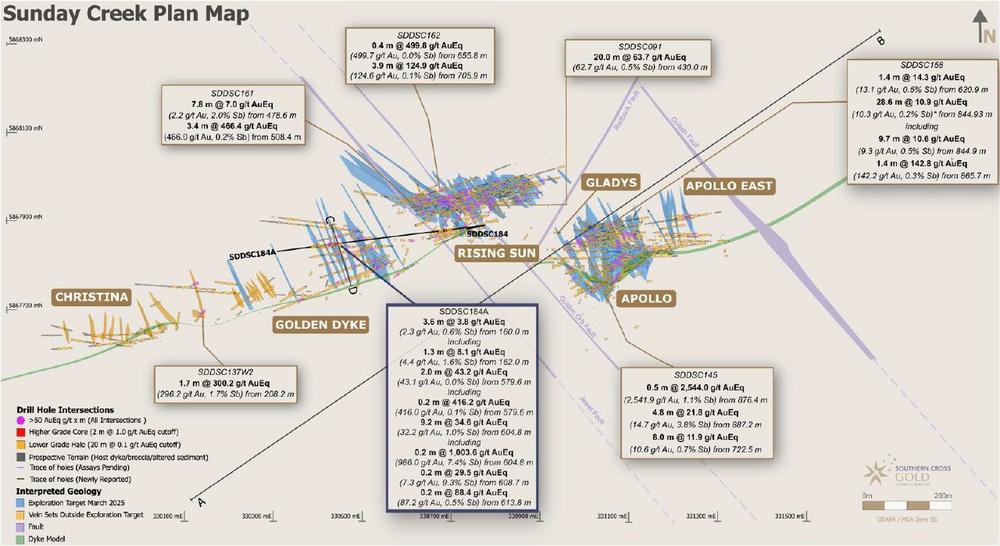 Michael Hudson, President & CEO states: “SDDSC184A has delivered the two highest individual gold grades ever recorded in the Golden Dyke system, 986 g/t Au and 416 g/t Au, both occurring within altered sediment. These exceptional grade intercepts, combined with the 9.2 m @ 34.6 g/t AuEq, demonstrate that Golden Dyke hosts the same high-grade tenor we’ve consistently seen at Rising Sun.