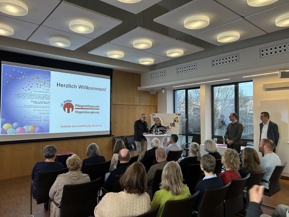 Manchmal geht es ganz schnell: ein Autounfall, eine schwere Krankheit oder ein Sturz im Bad. Der gewohnte Alltag ist vorbei, denn plötzlich geht es um Pflegegrade, Umbaumaßnahmen oder die Finanzierung einer Haushaltshilfe für die Eltern. Seit 15 Jahren bietet der Pflegestützpunkt Vogelsbergkreis Unterstützung und Beratung in diesen Lebenslagen – und hat dabei nicht nur das Rechtlich-Finanzielle, sondern auch die menschliche Seite der Medaille im Blick, betont Landrat Dr. Jens Mischak im Rahmen der Feier anlässlich des 15-jährigen Bestehens der Institution. Dazu sind neben Erstem Kreisbeigeordneten Patrick Krug auch René Lippert, Leiter des Amtes für Soziales und Ausländerrecht (ASA), Bastian Heck, Leiter des Sachgebiets Soziale Dienste im ASA, Angela Opitz, Gruppenleitung Pflegestützpunkte bei der AOK und viele weitere Wegbegleiter, Leistungsträger, Nachbarschaftshilfe- und Hospizvereine sowie Selbsthilfegruppen aus dem gesamten Vogelsbergkreis zusammengekommen.