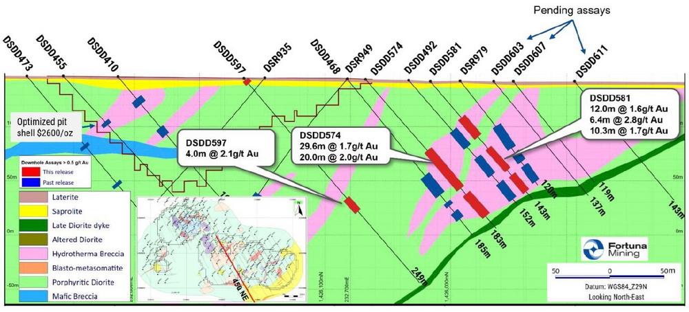 DSDD555: 6.8 g/t Au over an estimated true width of 35.5 meters from 48.6 meters, including
