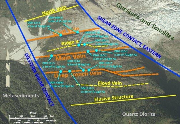 Goat Vein: 2,1 m mit einem Gehalt von 74,2 g/t Au, 6,3 m mit einem Gehalt von 15,7 g/t Au