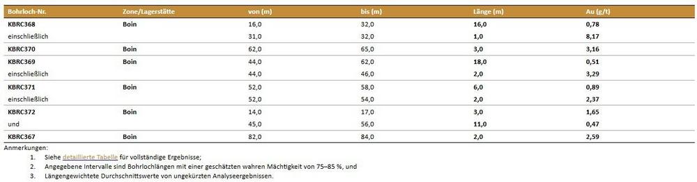 Die Bohrungen KBRC367 bis KBRC372 (6 RC-Bohrlöcher mit einer Gesamtlänge von 550 m) wurden im nordwestlichen Bereich der Goldlagerstätte Boin, und zwar in einer mineralisierten Struktur, die annähernd parallel zur Hauptzone der Lagerstätte verläuft, niedergebracht. Hier war das Ziel, die Lagerstätte durch die Erschließung einer oberflächennahen Mineralisierung zu erweitern. Die RC-Bohrungen bei Boin erfolgten in jeweils 50 Meter voneinander entfernten Abschnitten; die Bohrlöcher wurden entlang des jeweiligen Abschnitts in Abständen von 25 Metern abgeteuft. Die Bohrungen waren auf eine oberflächennahe Mineralisierung gerichtet; die einzelnen Bohrlöcher erreichten eine senkrechte Tiefe von maximal 70 Metern. Die in dieser Pressemitteilung erwähnten Bohrlöcher verteilen sich auf vier voneinander unabhängige Abschnitte, die sich über eine Streichlänge von 400 Meter erstrecken.