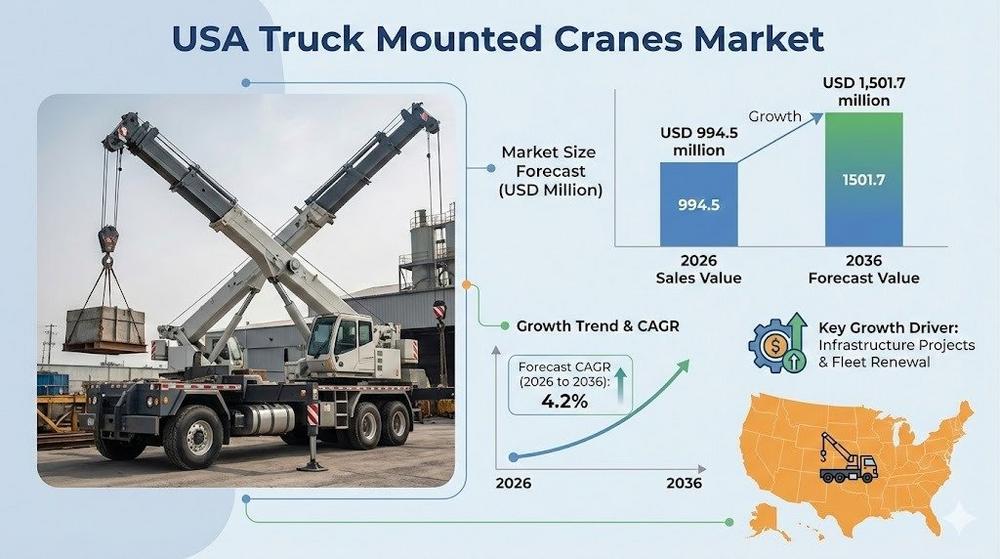 The Demand for truck mounted cranes in the USA is set to expand steadily over the next decade, supported by sustained infrastructure investment and rising utility servicing requirements. The market is valued at USD 994.5 million in 2026 and is projected to reach USD 1,501.7 million by 2036, registering a CAGR of 4.2% during the forecast period.