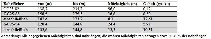 – In Bohrloch GC25-84 wurde ein 24,4 m langer Abschnitt mit 5,92 g/t Au in einer Tiefe zwischen 120,4 m und 144,8 m durchteuft; darin enthalten war ein Abschnitt von 12,2 m mit 10,51 g/t Au zwischen 132,6 m und 144,8 m Tiefe, 90 m unterhalb von Loch GC25-78, in dem auf 22,9 m ein Erzgehalt von 1,63 g/t Au ermittelt wurde.