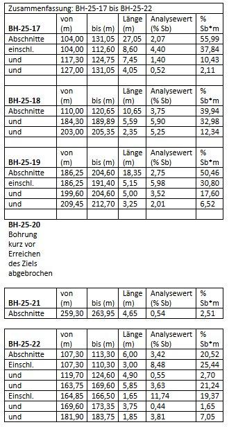 – Die Bohrung BH-25-22 weist 6 einzelne Zonen mit Antimonmineralisierung auf.