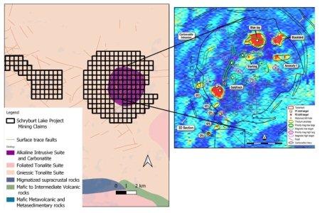 Schryburt Lake weist Anzeichen für ein multizentrisches, in Carbonatit enthaltenes Seltenerdmetall- (REE)- und Niob- (Nb)-System mit vier vorrangigen Zielen auf – Blue Jay, Goldfinch, Blackbird und Starling –, die jeweils durch das Zusammentreffen von mehrere Kilometer umfassenden radiometrischen Thoriumanomalien und tiefen dreidimensionalen magnetischen Körpern definiert werden und durch historische und aktuelle Explorationen unterstützt werden. Zusammen beschreiben diese Erkundungsgebiete das Potenzial für ein vertikal ausgedehntes REE-Nb-System, das sich in mehreren Zentren im Umfeld des Carbonatitkomplexes entwickelt hat.